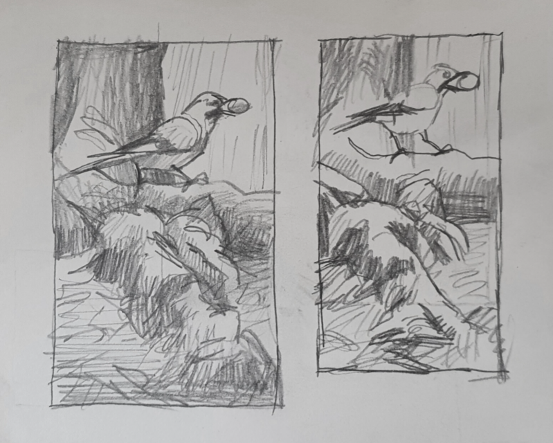 "Humble Beginnings" is is a painting about potential, perseverance and hard work. So naturally it is also a good metaphor for the creative process. All big things have small beginnings. Everything that makes the giant oak is already contained inside a single acorn. It's the same with art; you start with a simple idea or vision. In this case I wanted to paint a Eurasian jay. A beautiful woodland bird, most commonly seen in autumn and known to be a habitual acorn hoarder. They even call it "Jay of the Oaks" in French. Suddenly an image of a jay sitting on the roots of a mighty oak popped into mind. I realized the potential of my idea, the deeper meaning of such a simple scene. Time to grab the sketchbook and lay down the visual foundation.
